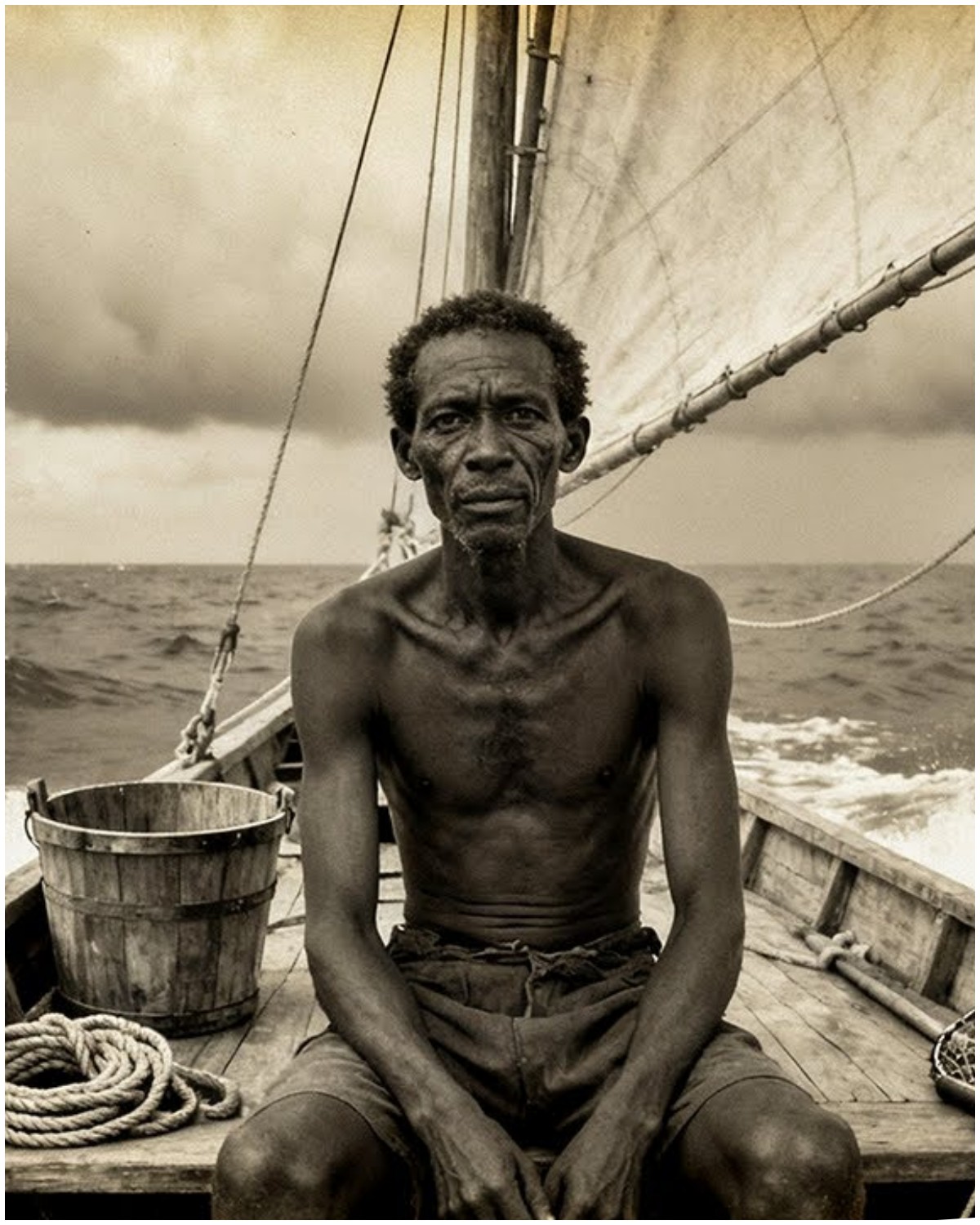 Il diciannovesimo giorno vide una nave. Era lontana, solo un puntino all'orizzonte. Ma ne vide le vele. Il cuore gli fece un balzo. Si alzò in piedi sulla sua barca e agitò le braccia. Gridò. La nave non cambiò rotta. Era troppo lontana. Non potevano vederlo o lo avevano visto e non gli importava. Un solo uomo africano su una piccola barca non valeva la pena di fermarsi. Guardò la nave scomparire. Si sedette. Non pianse. Non aveva più voglia di piangere. Raccolse la sua lenza e tornò al lavoro.