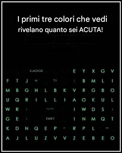 Osserva attentamente l'immagine qui sotto. I primi tre colori che noti dovrebbero rappresentare quanto sei intimidatorio agli occhi degli altri , per sicurezza, intelligenza, creatività o semplicemente per la tua presenza.