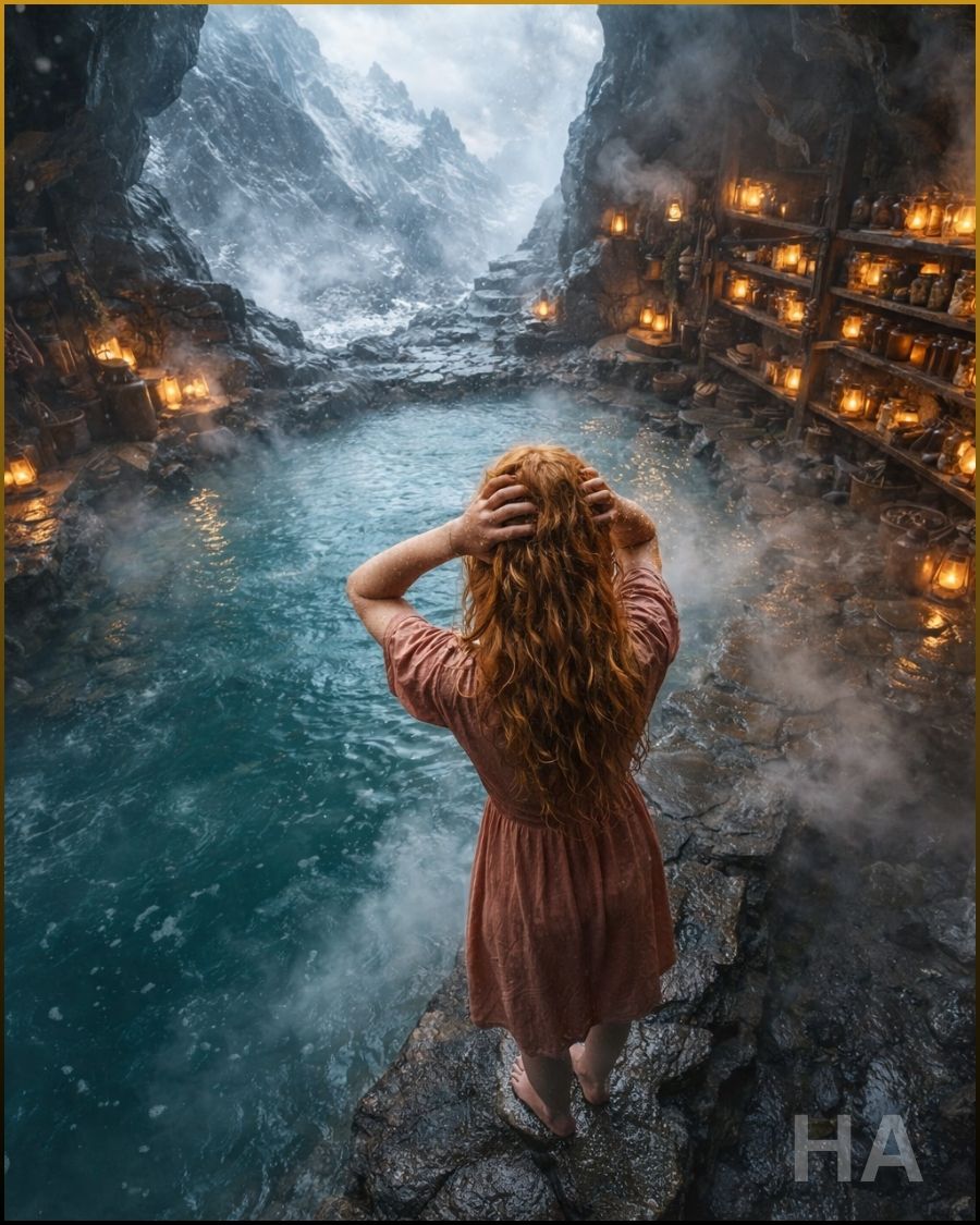 Il volto della donna era segnato e dai tratti decisi, i capelli neri striati d'argento e intrecciati lungo la schiena. Indossava gambali di pelle di alce sotto un pesante scialle e portava un fascio di radici alla vita. Il vapore si levava alle sue spalle tra gli alberi.