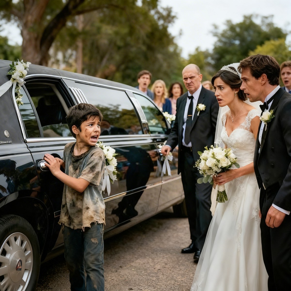 ¡No suban, han arruinado los frenos! —gritó el niño de ropas sucias y viejas, cubriendo la puerta con su cuerpo para que no entraran los recién casados.