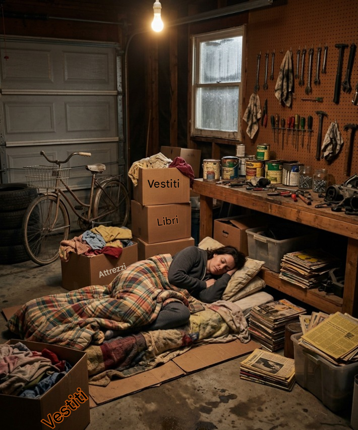 «La mamma è testarda», borbottò. «Potresti... magari restare in garage? Preparerò un materasso. Puoi accendere delle candele profumate. Sarà come campeggiare!»