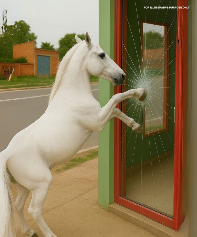 Il vetro si frantumò in mille pezzi che si sparsero sul pavimento, riflettendo la luce del sole come schegge di cristallo. Il cavallo nitrì più forte, le narici dilatate, gli occhi selvaggi per la disperazione.