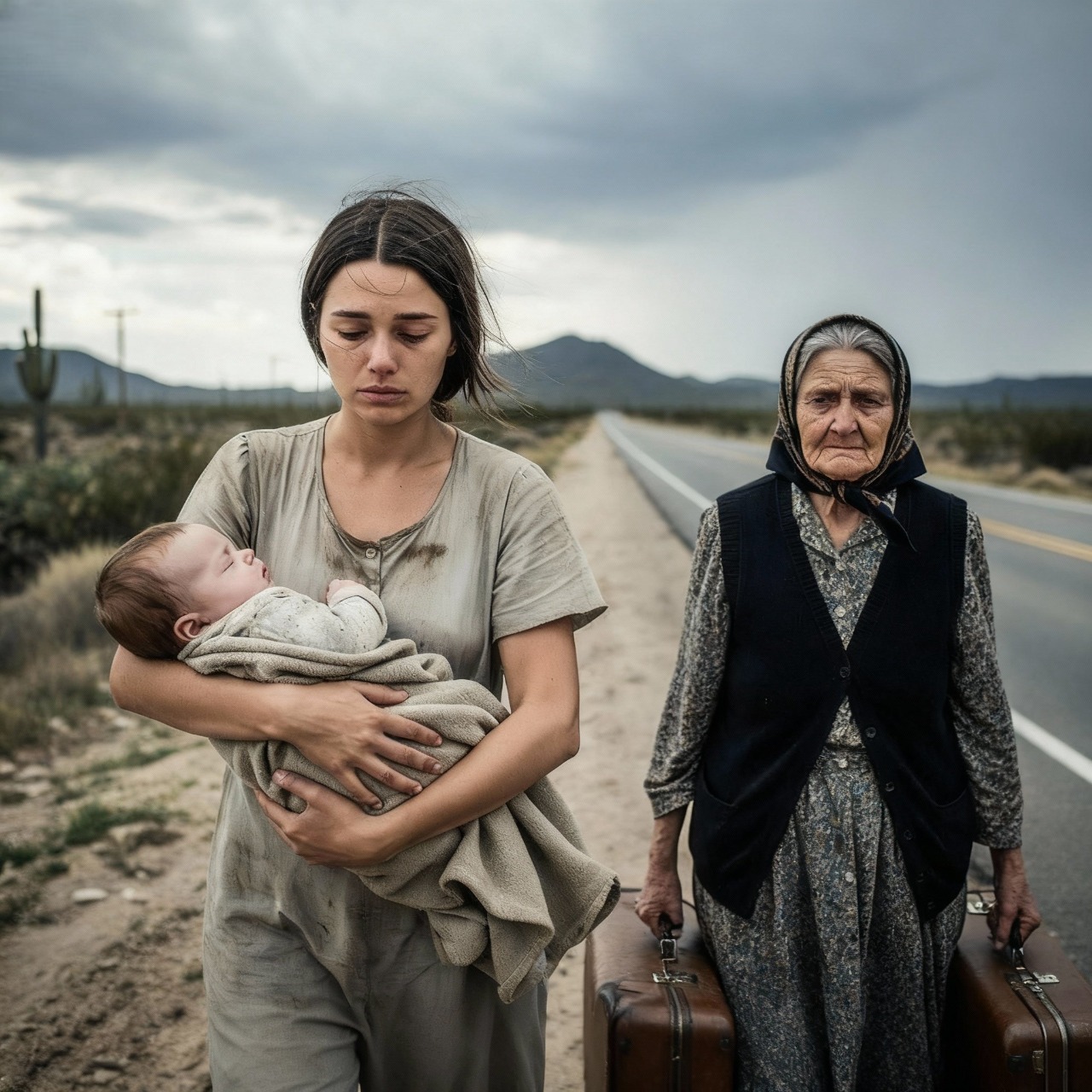 Non c'erano macchine, nessuno, solo loro tre: la giovane madre, la bambina innocente e la nonna tradita, che camminavano verso il nulla assoluto. Speranza era una parola che non ricordavano più come pronunciare nei loro cuori infranti. Il peso di Emiliano cominciava a farsi sentire tra le braccia di Renata. La bambina si agitava irrequieta, cercando il calore che lei riusciva a malapena a darle. Camminavano vicino alla linea bianca della strada, come se avessero paura di perdersi nell'immensità. "Dobbiamo fermarci, figlia mia", disse Silvia, con il respiro affannoso e debole.