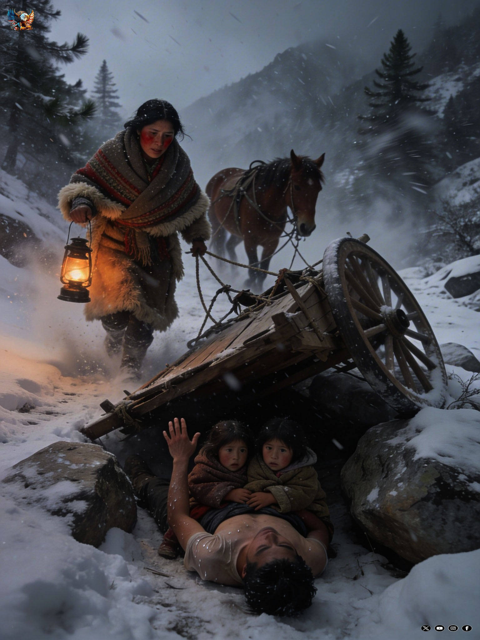All'ombra del carro, appena riparato dalle radici di un vecchio pino, un giovane era appoggiato al tronco. Il suo viso era pallido, le labbra livide e i capelli neri irrigiditi dalla neve. Non indossava il cappotto, solo una camicia sottile e fradicia che gli si appiccicava al corpo.